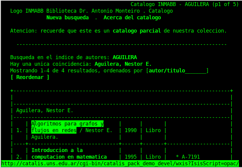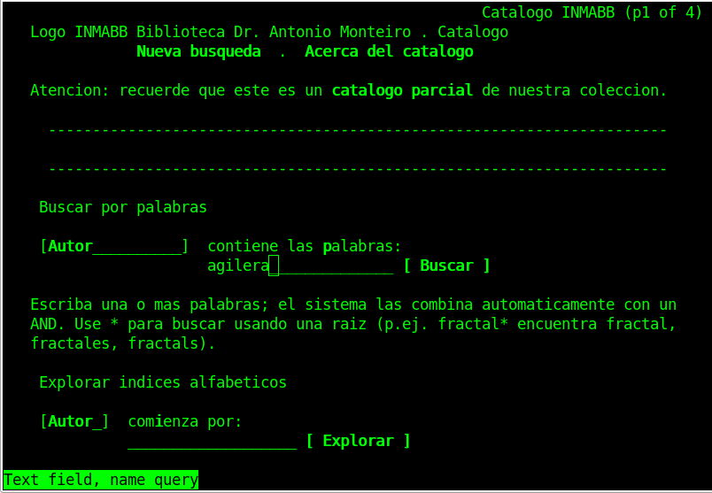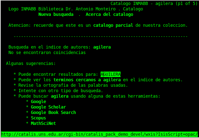 1. comando: links http://inmabb.criba.edu.ar/catalogo/ (en una consola de 80 x 25) 2. pantalla inicial, con término de búsqueda (con error) 3. pantalla con sugerencias 4. pantalla con lista de resultados asociados al término sugerido